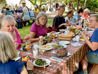 Så kommer linsesuppa, mens vi venter på hovedretten. Vi kan velge mellom kyllingspyd, kjøttboller og langtidskokt oksekjøtt i leirgryte, og med godt drikke til. Alt smaker fantastisk nydelig og alle koser seg, - det er lett å se! Yoghurt med honning til dessert. Det er lunsjen sin det!