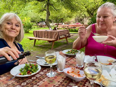 Her i Soganli-dalen er ikke bare en "skjult kirke", men også en skjult eplehage! Vi kjenner vi er skikkelig sultne nå, og gleder oss veldig. "Soganli Hidden Apple Garden" ligger rett før inngangsporten på venstre side. Stedet eies og drives av sjarmerende Yilmaz Aplak, som har holdt til her i 25 år, og lager egen økologisk mat. Merete har booket lunsjen for oss i god tid, så nå venter langbordet på oss...