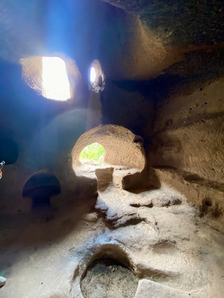 Vi skjønner fort at dette ikke er plassen for dem som har klaustrofobi, for dette er trangt og smalt. Tunnelene er lave, og vi må ofte gå ned på huk, det er smale, svingete ganger og bratte trapper. Og innimellom er det rom med vanlig takhøyde, som har en rekke bruksområder; vannbrønner, lagerrom, kirker, staller og kjøkken. Flere rom ble brukt til sosiale samlinger. Gravkamre er det også her nede.