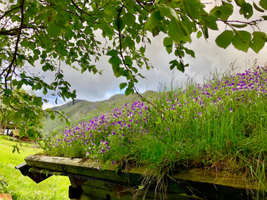 Her er så vakkert, med alle de små husa med gress og stemorsblomster på taket. Bekken går rett utenfor eldhuset, og det bråker godt etter alt regnet. Men det er bare go'lyd og vi venner oss fort til...