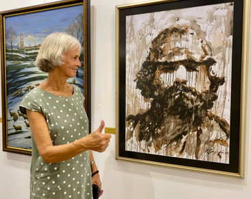 Av skiltet på utsiden ser vi at vi er på rett plass, og det første navnet på listen er vår mann, Agim Bujupi, så dette går strålende! Moro! Det viser seg at de har en utstilling i foajéen, og det er helt fantastisk å komme inn i det svale rommet og vekk fra den brennhete sola for noen minutter. Vi tar oss god tid og kikker på hele utstillingen, som mest består av malerier, men også av skulpturer. Bl.a. et morsomt tusenbein som får skoa sine pusset, utskåret i tre.