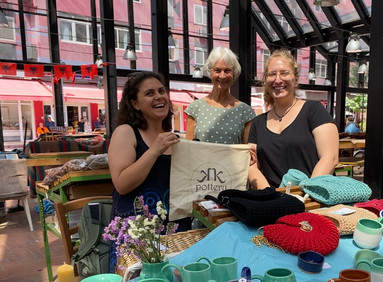 Vi prater med to jenter som har sitt eget utsalg. Den ene lager keramikk og den andre hekler vesker. De er veldig blide og stiller villig opp for et bilde.