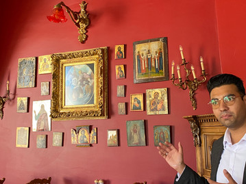 Guiden er klar for å vise oss litt rundt, og fortelle mere om stedet, og vi følger på. Jeg får med meg litt av det han sier, men ikke alt. Overalt er vi omgitt av antikviteter og kunst med en unik historie. Her er sverd fra det ottomanske riket, første publikasjoner av bøker fra kjente filosofer, 1300-talls kirkedører som er gjort om til vakre bord, mange malerier og skulpturer. En eldgammel stol som er helt slitt i skinnet, og en gammel bibel, hvor det står "Please don't touch!"