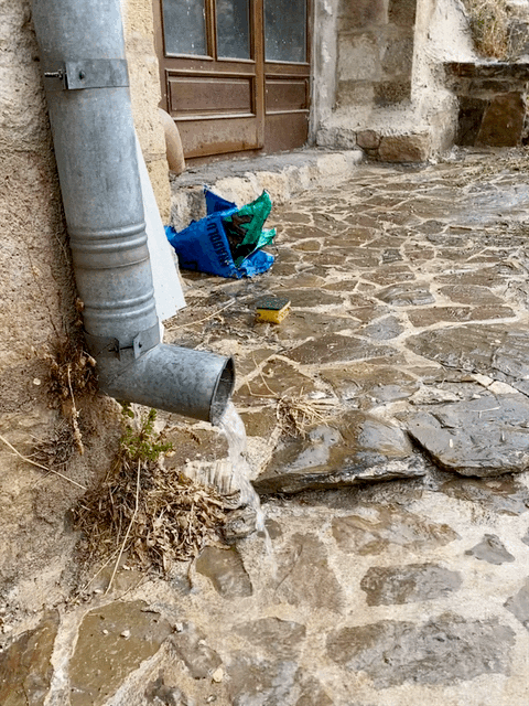 Vi våkner til regn og tordenvær, og det er ikke måte på regn, - det nemlig bøtter ned! Paraplyene må fram så vi kommer oss tørrskodd opp, og inn der frokosten serveres. Så får vi prøvd det koselige rommet øverst oppe, med tømmervegger og hyggelig innredning. Og maten smaker fortreffelig!